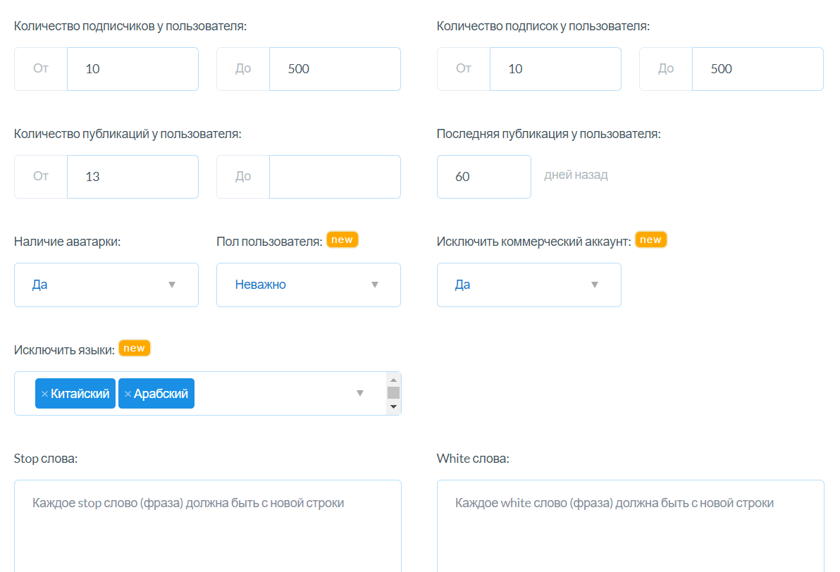 ΡΡΡΠ΅Π³Π°ΠΌ, Π³Π΅ΠΎΠΏΠΎΠ»ΠΎΠΆΠ΅Π½ΠΈΡ ΠΈΠ»ΠΈ ΠΏΠΎ Π²Π·Π°ΠΈΠΌΠΎΠ΄Π΅ΠΉΡΡΠ²ΠΈΡΠΌ Ρ ΠΏΠΎΡΡΠ°ΠΌΠΈ. ΠΠΎΠΆΠ½ΠΎ ΡΠΊΠ°Π·Π°ΡΡ ΠΏΠ°ΡΠ°ΠΌΠ΅ΡΡΡ ΡΡΡΠ°Π½ΠΈΡΡ: ΠΏΠΎΠ», Π°ΠΊΡΠΈΠ²Π½ΠΎΡΡΡ, ΠΏΠΎΠ΄ΠΏΠΈΡΠΊΠΈ ΠΈ ΠΏΡΠΎΡΠ΅Π΅. ΠΠΎΡΠ»Π΅ ΠΎΠΊΠΎΠ½ΡΠ°Π½ΠΈΡ ΠΏΠΎΠΈΡΠΊΠ° ΠΌΠΎΠΆΠ½ΠΎ ΡΠΊΡΠΏΠΎΡΡΠΈΡΠΎΠ²Π°ΡΡ Π±Π°Π·Ρ Π² ΡΠ°ΠΉΠ» ΠΈΠ»ΠΈ ΡΠ°Π±ΠΎΡΠ°ΡΡ Ρ Π½Π΅ΠΉ Π² Π»ΠΈΡΠ½ΠΎΠΌ ΠΊΠ°Π±ΠΈΠ½Π΅ΡΠ΅ Instaplus. ΠΠ»Ρ ΡΡΠΎΠ³ΠΎ ΠΌΠΎΠΆΠ½ΠΎ ΠΏΠ΅ΡΠ΅Ρ