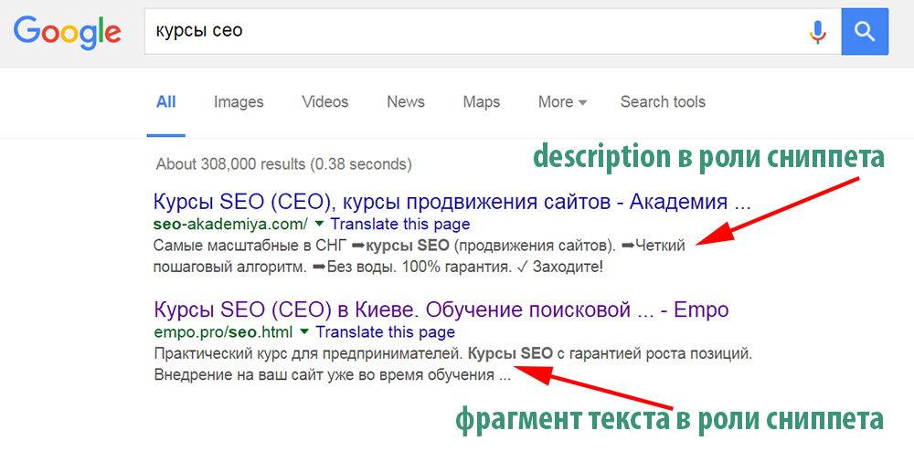 Пользователю останется изучить snippet (краткое описание) и перейти на понравившийся.