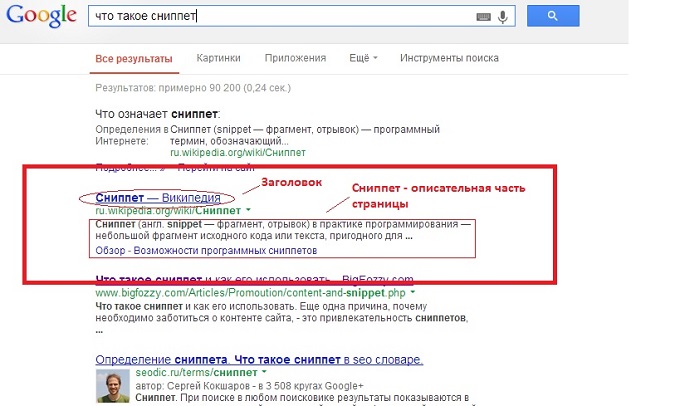 Заглавие сниппета формируется на базе тега , а информация о сайте – . Если данные теги не указаны вручную, то сайт автоматически подбирает надлежащие заглавия и описание, которые указываются в самой интернет-странице.