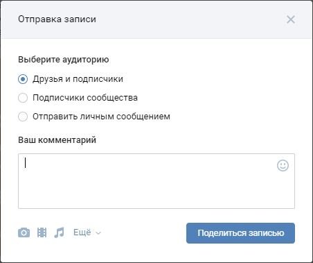 Когда делаешь репост (кнопка Поделиться), ВК предлагает выбор: на своей стене, в сообществе, в истории, в личном сообщении. Бывает, что не все эти варианты доступны (например, нельзя поделиться с друзьями) или в списке сообществ нет нужной группы.