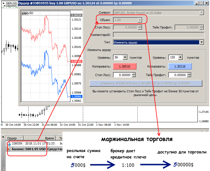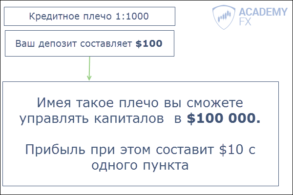 Получается, имея на балансе (депозите) всего 1000$ и плечо 1:100, трейдер реально торгует как на 100 000$.