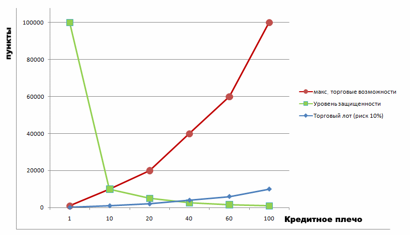 Если клиент, имея 100.000, будет торговать контрактом размером 10.000, 50.000 или 100.000, то получится, что торговля ведется собственными средствами без использования кредитного плеча вообще.