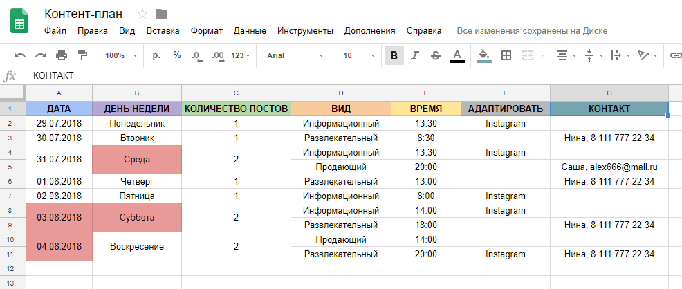 Рабочая таблица для контент-плана в InstagramОбразец контент-плана: https://docs. google.com/spreadsheets/d/1F6T9teSVwwRM9FTqY_eaEXowK8oSKXNDSW_2Yua3ct4/edit#gid=0