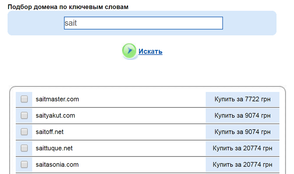 Предлагает осуществить поиск по нескольким критериям. Отличием сервиса от других служит проверка списком, при котором вводится перечень ключевых слов. При этом есть возможность выкупить домен у текущего владельца (статус «Аукцион»):
