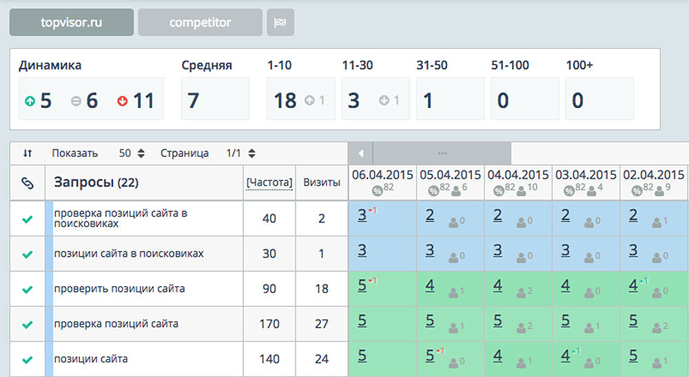 ΠΡ ΠΌΠΎΠΆΠ΅ΡΠ΅ Π΄ΠΎΠ±Π°Π²ΠΈΡΡ ΠΊ ΡΠ²ΠΎΠ΅ΠΌΡ ΡΠ°ΠΉΡΡ ΠΊΠΎΠ½ΠΊΡΡΠ΅Π½ΡΠΎΠ² ΠΈ ΡΡΠ°Π²Π½ΠΈΠ²Π°ΡΡ ΡΡΠΏΠ΅Ρ ΠΈ. Π ΡΠ°Π·Π΄Π΅Π»Π΅ ΠΠΎΠ½ΠΊΡΡΠ΅Π½ΡΡ Π΄ΠΎΠ±Π°Π²ΡΡΠ΅ Π΄ΠΎ ΠΏΡΡΠΈ Π°Π΄ΡΠ΅ΡΠΎΠ² ΡΠ°ΠΉΡΠΎΠ², ΠΊΠΎΡΠΎΡΡΠ΅ Π²Ρ Ρ ΠΎΡΠΈΡΠ΅ Π΄ΠΎΠ±Π°Π²ΠΈΡΡ ΠΊ ΡΡΠ°Π²Π½Π΅Π½ΠΈΡ. ΠΠΈΠΆΠ΅ ΠΏΠΎΡΠ²ΠΈΡΡΡ ΡΠ²ΠΎΠ΄ΠΊΠ° ΠΏΠΎ ΡΡΠ΅Π΄Π½Π΅ΠΉ ΠΏΠΎΠ·ΠΈΡΠΈΠΈ ΠΈ Π³ΡΠ°ΡΠΈΠΊ Ρ Π΄ΠΈΠ½Π°ΠΌΠΈΠΊΠΎΠΉ. ΠΠ°Π²Π΅Π΄ΠΈΡΠ΅ Π½Π° ΡΠΎΡΠΊΡ Π½Π° Π³ΡΠ°ΡΠΈΠΊΠ΅, ΡΡΠΎΠ±Ρ ΡΠ²ΠΈΠ΄Π΅ΡΡ ΡΠΈΡΠ»ΠΎΠ²ΡΠ΅ Π΄Π°Π½Π½ΡΠ΅.