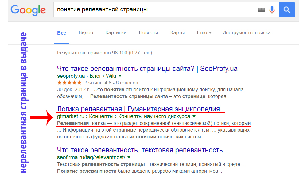 Релевантность страницы поиска — это то, насколько результат поиска соответствует ожиданиям человека. Синоним релевантности — это адекватность выдаваемой поисковиками информации.
