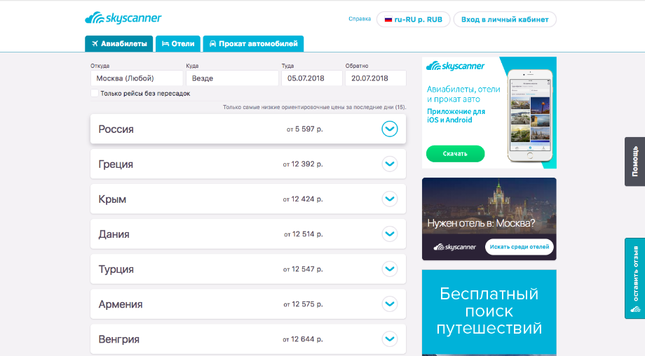 Скайсканнер: поиск Везде, который позволяет найти дешевые авиабилеты