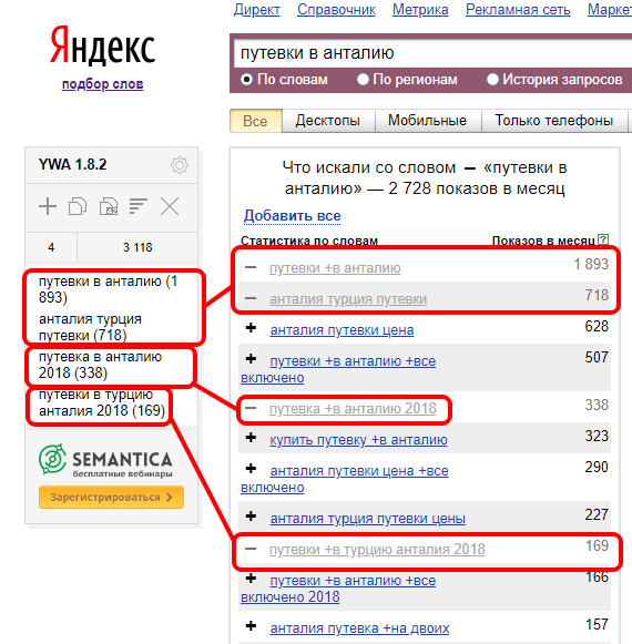 Для примера мы соберем небольшое ядро по путевкам в Анталию. В качестве «базовых» у нас будет 2-й запрос – «туры в анталию» (в данном случае количество «базовых» запросов не принципиально).