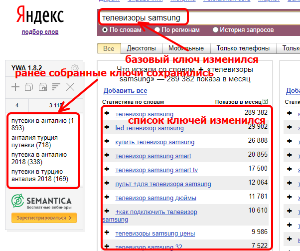 Также стоит отметить, что список будет сохранен ровно до тех пор, пока он лично Вами не будет откорректирован или очищен. Т.е. если вбить в строку «телевизоры samsung», то список ключей Яндекс.Wordstat обновится, но ранее собранные ключи в списке плагина сохранятся.
