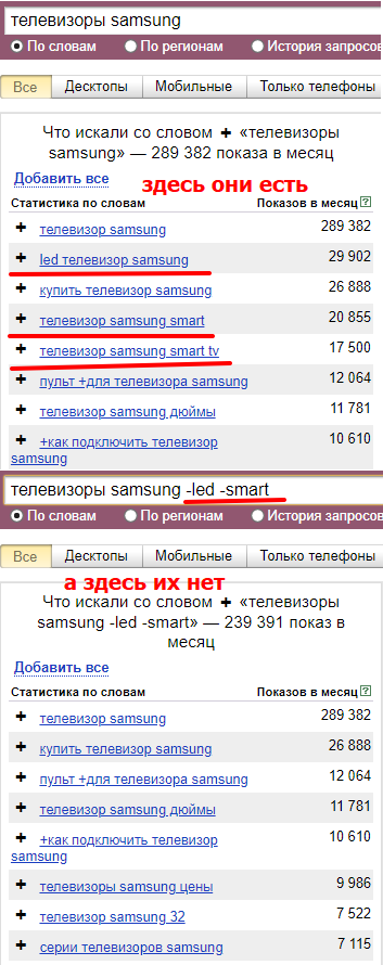 Работу минус-слов вы можете проверить, введя их через знак «-» после поисковой фразы (маски). В полученных результатах фразы, содержащие указанные минус-слова, исчезнут: