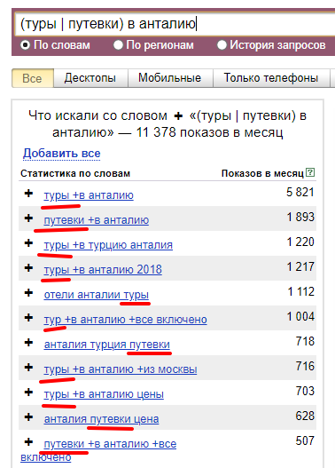 Есть и еще один хитрый оператор – вертикальный разделитель. Он необходим для того, чтобы объединить сразу несколько списков ключей в один (речь про однотипные ключи). Для примера возьмем два ключа: «туры в анталию» и «путевки в анталию». В строке Яндекс.Wordstat прописываем их следующим образом и получаем на выходе 2 списка по этим ключам, объединенных в один: