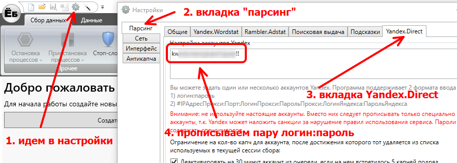 Далее введем данные от дополнительной учетной записи на Яндексе, созданной специально для сбора поисковых фраз. Используем ее только для данной программы. Для ввода данных заходим в настройки в верхнем левом углу, выбираем пункт в открывшемся диалоговом окне «Yandex.Direct» и вводим в поле через двоеточие логин (без @yandex.ru) и пароль от дополнительной учетной записи. Далее нажимаем внизу на кнопку «Сохранить изменения» и возвращаемся обратно в основное рабочее поле приложения.
