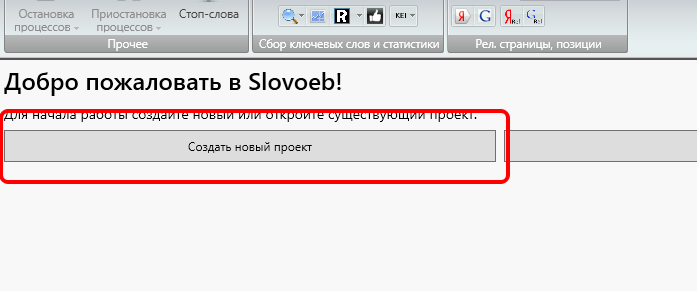 Открываем скаченное приложение СловоЁБ и нажимаем на кнопку «Создать новый проект». Озаглавливаем его и открываем. Обязательно указываем нужный регион (регионы, страну) для сбора будущего семантического ядра: