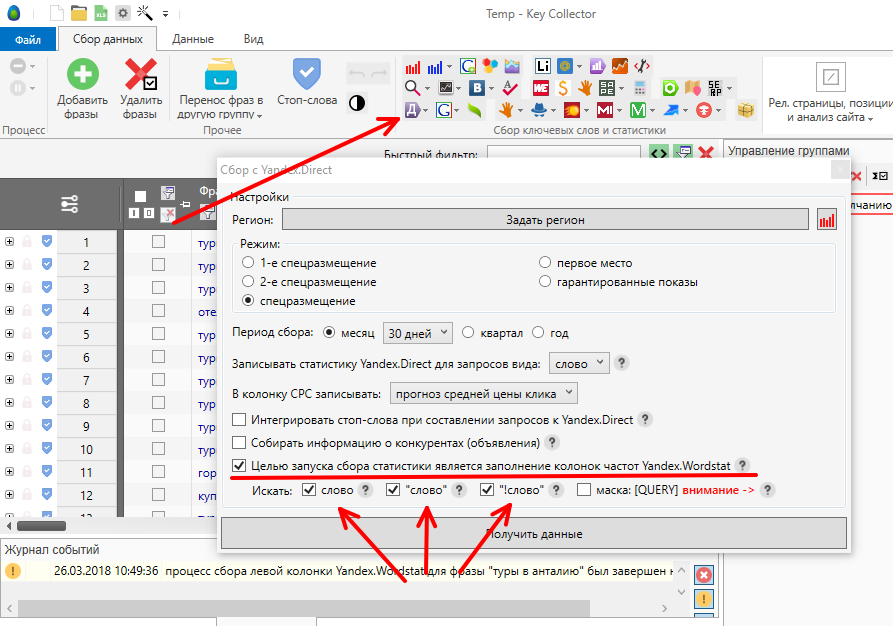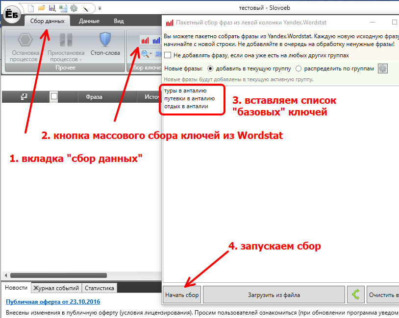 Для сбора ключей из Яндекс.Wordstat на вкладке «Сбор данных» нажимаем на кнопку «Пакетный сбор слов из левой колонки Яндекс.Wordstat», вставляем список ранее подготовленных ключевых фраз, нажимаем «Начать сбор» и ждем его окончания. Минус у такого способа сбора только один – после окончания парсинга приходится вручную удалять ненужные ключи.
