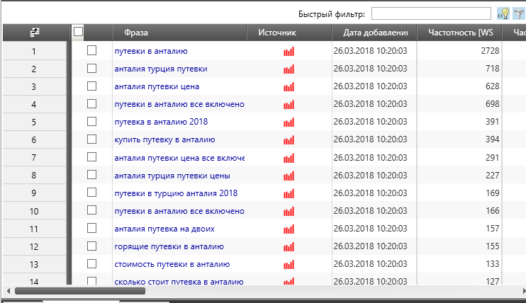 Ждем, пока приложение соберет частотности каждого из найденных запросов. Этот процесс может занять больше времени, чем основной сбор поисковых фраз. В результате получим следующую картину: