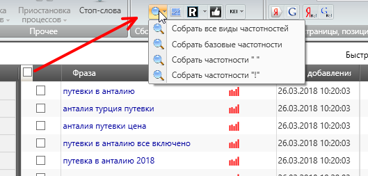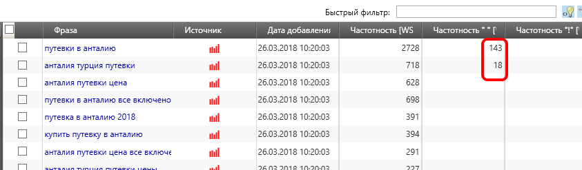 Далее проведем работу по анализу частотности полученных поисковых фраз. Для этого будем использовать частотность с кавычками: таким способом мы увидим количество запросов именно той фразы, которая была найдена приложением. Не фразы с различными добавлениями, а чистого запроса. Например: сколько раз пользователи поисковой системы искали фразу «вечерние платья», а не пул множества фраз, содержащих словосочетание «вечерние платья». Благодаря такому методу проверки вы найдете рабочие ключевые фразы для SEO оптимизации, которые в дальнейшем стоит добавить к семантическому ядру.