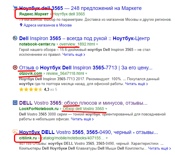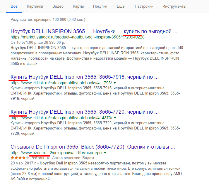 Во-первых, данные запросы лучше не «смешивать». Например, у нас есть 3 поисковых запроса – «ноутбук dell 5565 amd a10 8 гб hd купить», «ноутбук dell 5565 amd a10 8 гб hd обзор» и «ноутбук dell 5565 amd a10 8 гб hd». Ключи почти полностью идентичны. Однако, именно отличия и играют решающую роль. В первом случае мы имеем «транзакционный» запрос, по которому нужно продвигать именно карточку товара. Во втором – «информационный», а в третьем — «прочий». И если по информационному ключу нужна отдельная страница, то логично задать вопрос – а что делать с третьим ключом? Очень просто – просмотреть ТОП-10 Яндекса и Google по данному запросу. Если будет много торговых предложений – значит запрос все-таки коммерческий, а если нет – значит информационный.